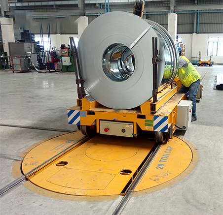 Manually pushing traditional transfer carts loaded with heavy materials (e.g., engine blocks, large molds) is already labor-intensive, and turning requires multiple workers – a process that is both unsafe and inefficient. The turntable rotation of these carts adopts a “low-effort drive” design: manual models use bearings to reduce resistance, requiring only 5-10kg of force to rotate the platform; electric models feature one-click rotation with a braking lock function. Even materials weighing 1-5 tons can be turned stably, significantly reducing labor intensity and avoiding safety accidents caused by human error.