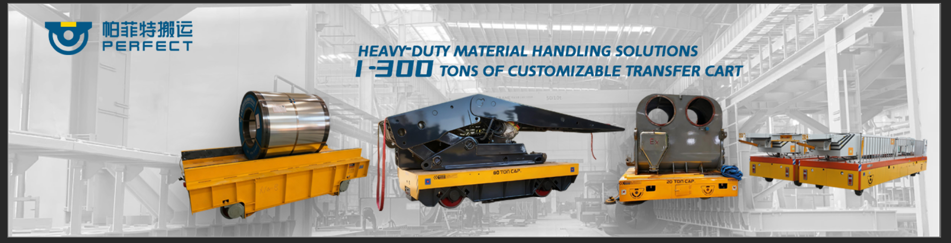The heavy load electric battery transfer trolley has a large load range from 1t to 300t. According to customer's special requirements, specific load ability is designed. And also, different table shape is designed according to different cargo shapes, for example coil car, ladle car, scissor lifting table cargo, etc.